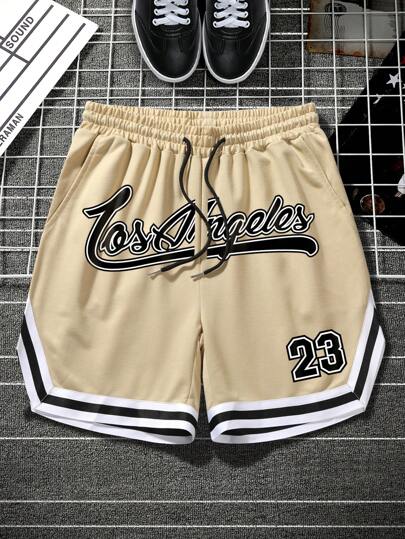 Manfinity Campus Court Pantalones cortos holgados para hombre con estampado de letras y ribete a rayas, con cordón en la cintura, pantalones cortos tipo jogger para baloncesto - Caqui - Añade 1