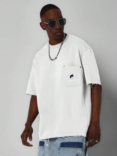 SUMWON Camiseta de manga corta con bolsillo parche y detalle de dobladillo deshilachado, con ajuste regular - Blanco - Añade 1