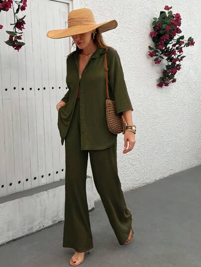 EURMUSE Conjunto de dos piezas con blusa holgada y pantalón para mujer - Verde militar - Añade 1