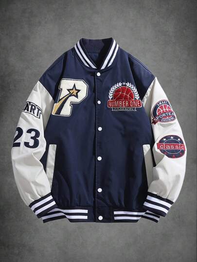 Chaqueta estilo béisbol de baloncesto retro, abrigo de hombre con combinación de colores de moda, diseño de bordado de alfabeto de estilo deportivo, estilo academia de ocio callejero para todo el año en primavera y otoño - Azul - Añade 1