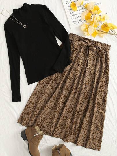 Seusyu Conjunto de camiseta de punto acanalado y falda con lazo frontal de estampado de leopardo - Multicolor - Añade 1