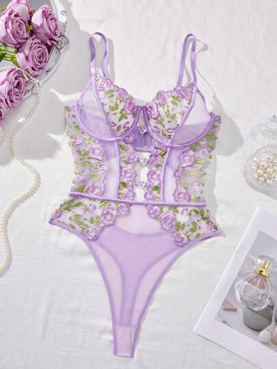 Bodyduit de encaje transparente con bordado de rosa para salir de fiesta - Morado Violeta - Añade 3