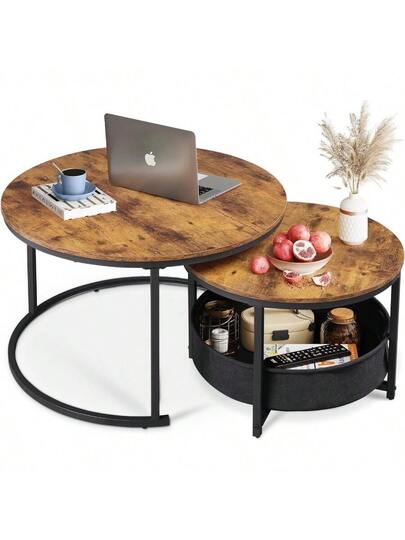 Round Coffee Table Set Of 2 Larger 80CM & 60CM Nesting Tables With Ample Storage, Premium Quality Modern Design For Living Room Or Office, Rustic Brown - Marrón rústico - Añade 2