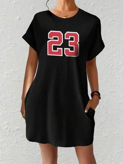 SHEIN EZwear Vestido Redondo Con Cuello Impreso Con Números - Negro - Añade 3