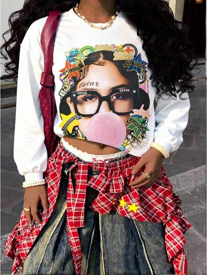 Rovax Sudadera holgada de mujer con cuello redondo, hombros caídos y manga larga con estampado gráfico - Blanco - Añade 1