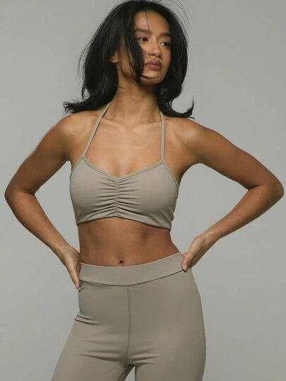 Musera Sport Sujetador deportivo con cuello halter y tirantes fruncidos, para pádel, tenis, pickleball, gimnasio y fitness - Verde militar - Añade 2