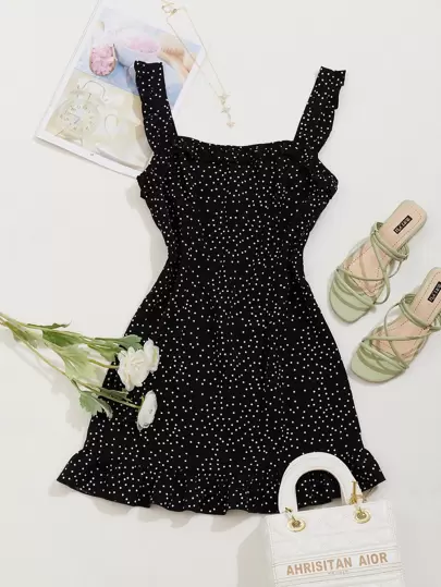 Trelyra Vestido de lunares ribete con fruncido - Negro - Añade 4