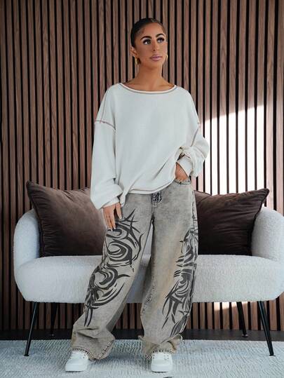 SAYEHFBABY Jeans de pierna ancha con estampado retro de estilo casual y de moda - Azul lavado medio - Añade 5