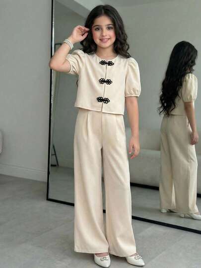 SHEIN Conjunto de 2 piezas de blusa de manga abullonada con cuello redondo y pantalones de pierna ancha, casual y elegante para niñas - Albaricoque - Añade 1