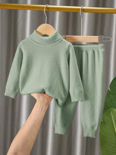 SHEIN Leap Crew Set de 2 piezas de jersey de cuello alto suave y cómodo y pantalones a juego, versátil y informal, para niño/niña, adecuado para primavera, otoño e invierno - Verde - Añade 1