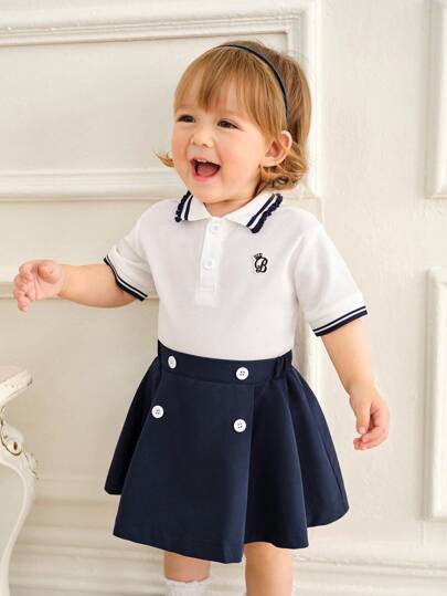 SHEIN Set de 2 piezas Conjunto casual de verano para niña con blusa de cuello polo con botones y mangas con volantes, y falda plisada - Azul y blanco - Añade 2