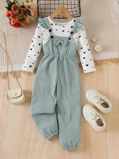 SHEIN 2 piezas/set Conjunto informal de sudadera de manga larga y mono estampado con corazones para niña joven, primavera/otoño - Verde - Añade 2