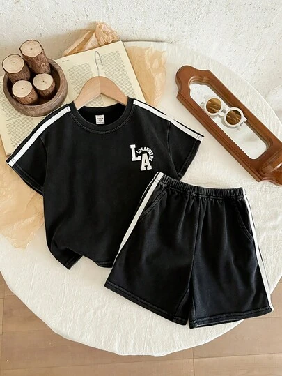 SHEIN Set de 2 piezas de camiseta de manga corta con estampado de copos de nieve y pantalones cortos de cintura elástica de unicolor, estilo de moda callejera coreana informal para niños preadolescentes, adecuado para volver al colegio, cumpleaños, baby shower, fiesta de vacaciones, primavera/verano