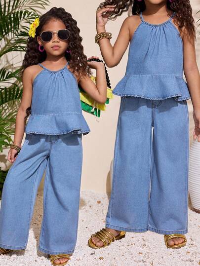 SHEIN Set de 2 piezas con top de mezclilla con cuello halter y volantes en el dobladillo, y pantalones de ajuste holgado para niña joven - Lavado ligero - Añade 1
