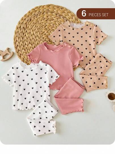 SHEIN Set de 6 piezas Dozemod Pijama para recién nacida con Top de manga corta con cuello redondo y volantes con estampado de corazón minimalista y pantalones largos de punto - Multicolor - Añade 2
