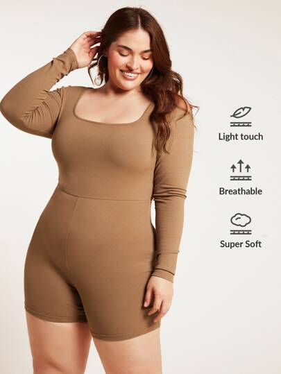 SHEIN BASICS Mameluco Unicolor Con Cuello Redondo - Camel - Añade 5
