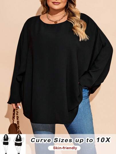 SHEIN CURVE+ Blusa de cuello redondo de unicolor con mangas tipo murciélago anchas para mujer de talla grande, otoño/invierno - Negro - Añade 3