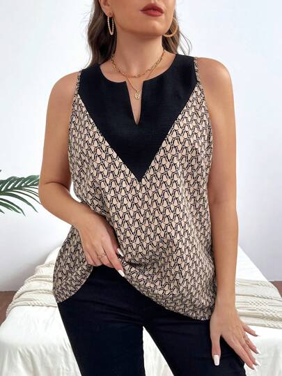 SHEIN Clasi Blusa sin mangas de talla grande con cuello en V con muesca y estampado geométrico de contraste - Multicolor - Añade 1