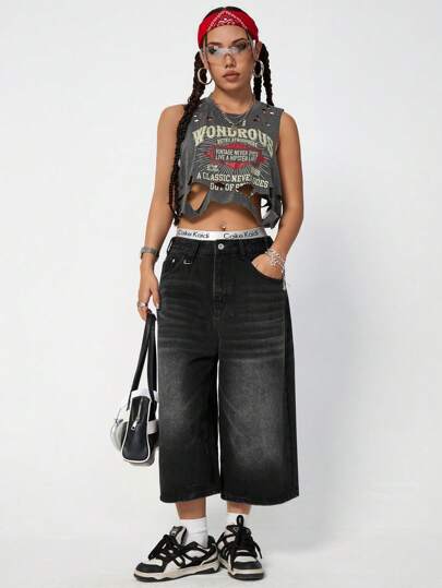 SHEIN Coolane Parte superior de corte acanalado con eslogan estampado y efecto desgastado para el verano - Gris Oscuro - Añade 4