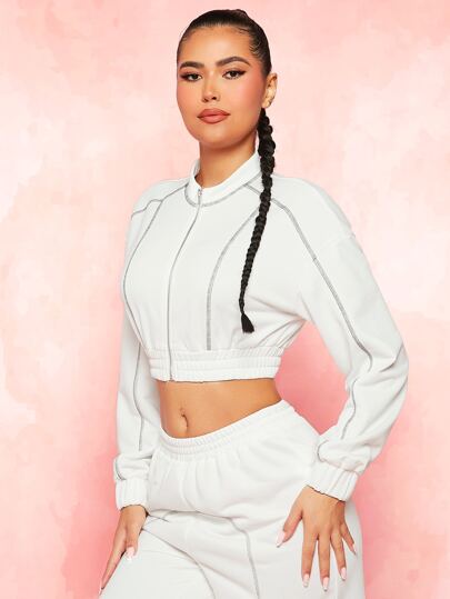 SHEINNeu Sudadera crop de hombros caídos con puntada en contraste tapeta con cremallera - Blanco - Añade 5