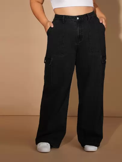 SHEIN ICON Jeans cargo con bolsillos con solapa - Negro - Añade 1
