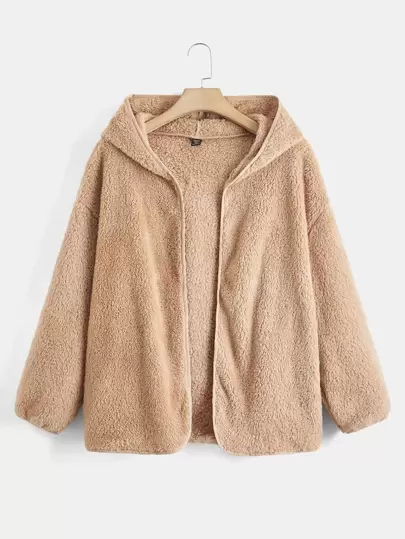 SHEIN EZwear Chaqueta tipo teddy con capucha y parte delantera abierta, talla grande, para invierno - Camel - Añade 1