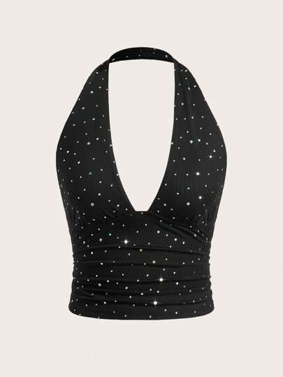 Muchica Top halter corto con espalda descubierta de tela de malla brillante - Negro - Añade 1
