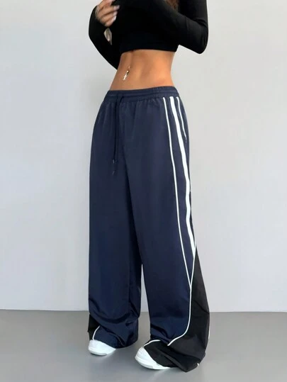 SHEIN EZwear Pantalones rectos casuales de mujer con bloques de color y parches, con cordón - Azul - Añade 2