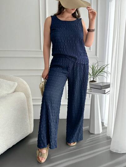 RueChic Talla grande unicolor Top tank & Pantalones de pierna ancha - Azul Marino - Añade 5