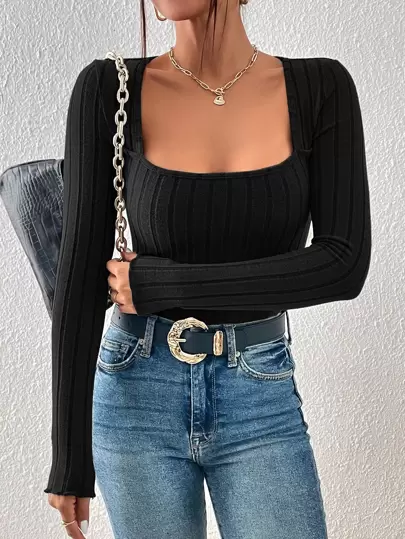 SHEIN Frenchy Camiseta de cuello cuadrado ribete en forma de lechuga - Negro - Añade 5