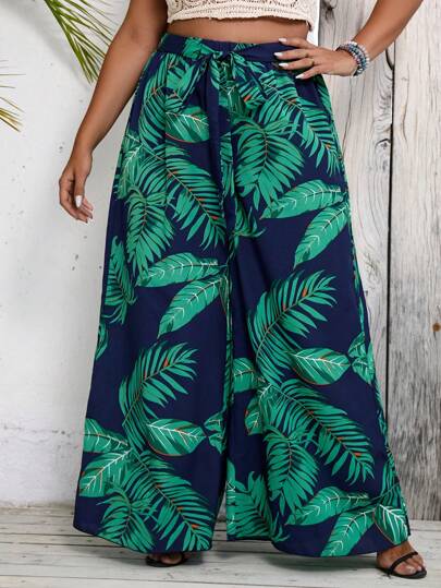 SHEIN Holidaya Pantalones de pierna ancha con estampado tropical con cinturón