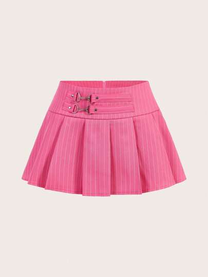 SHEIN ICON Falda Corta Plisada A Rayas Decorada Con Hebilla Metálica De Cintura Baja - Rosa Fucsia - Añade 1