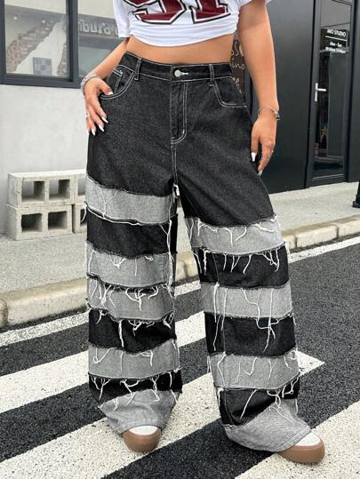 SHEIN ICON Jeans casuales de talla grande para mujeres con bolsillo delantero con botones y unicolor con efecto de empalme - Negro - Añade 2