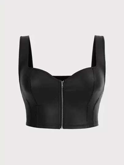 SHEIN ICON Top de tirantes con cremallera de piel sintética talla grande, de verano - Negro - Añade 1