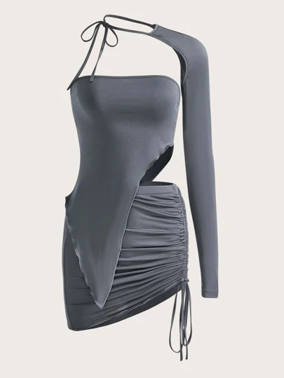 SHEIN ICON Conjunto De Dos Piezas De Un Top De Tubo Asimétrico Sólido Y Una Falda Con Cordón Lateral Y Una Manga - Gris Oscuro - Añade 1