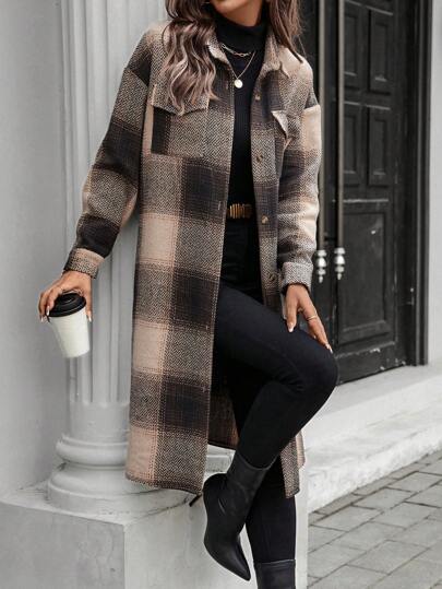 SHEIN LUNE Abrigo casual y de trabajo a cuadros con cuello vuelto y botones por delante para mujer - Multicolor - Añade 1