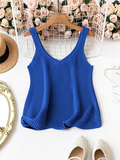 SHEIN LUNE Camiseta de punto de unicolor para tallas grandes, minimalista y de moda para el verano - Azul - Añade 1