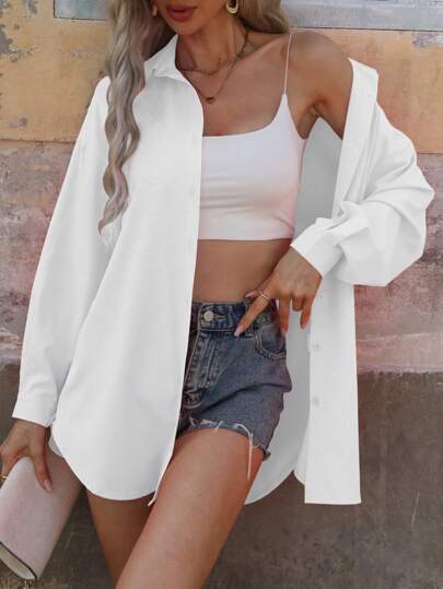 SHEIN Clasi Camisa casual de manga larga con botones en color liso, blusas de manga larga - Blanco - Añade 6