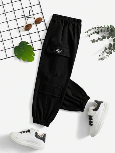 SHEIN Leap Crew Pantalones De Carga Casuales Con Bolsillos Laterales Para Niño Joven - Negro - Añade 1
