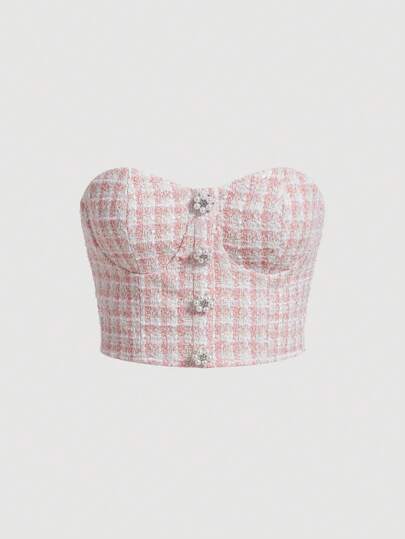 SHEIN MOD Top bandeau con estampado de cuadros con botón delantero - Multicolor - Añade 1