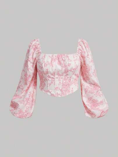 SHEIN MOD Talla grande Blusa con estampado floral de cuello cuadrado de manga farol - Rosa - Añade 1