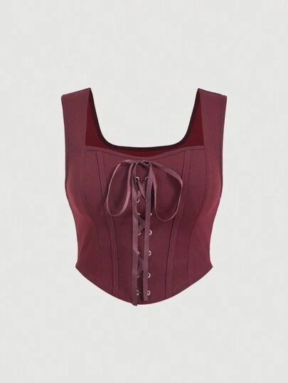 SHEIN MOD Talla grande 1 pieza Camiseta con estructura de corset, lazo delantero y cordones - Burdeos - Añade 1