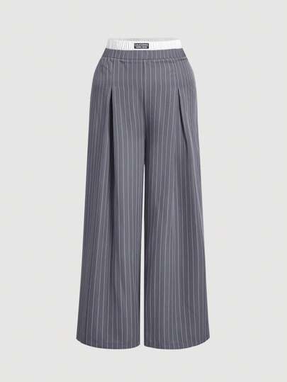 SHEIN MOD Pantalones de talla grande con estilo vintage, con cintura de contraste de color, plisados y a rayas - Gris - Añade 3