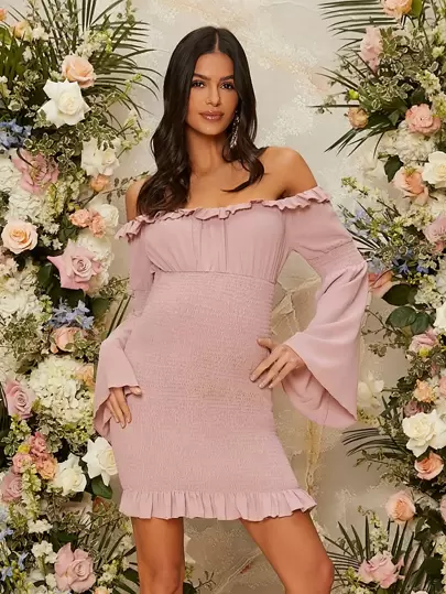 SHEIN Maternidad Vestido de hombros descubiertos fruncido con fruncido bajo con fruncido - Rosa Pálido - Añade 5