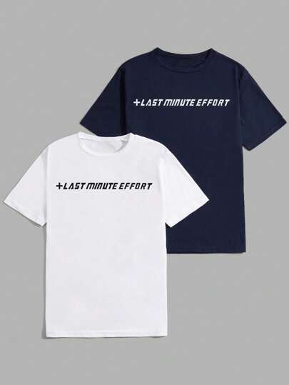 RueChic Camisetas de algodón para hombre, dos piezas, con estampado de letras - Azul y blanco - Añade 4