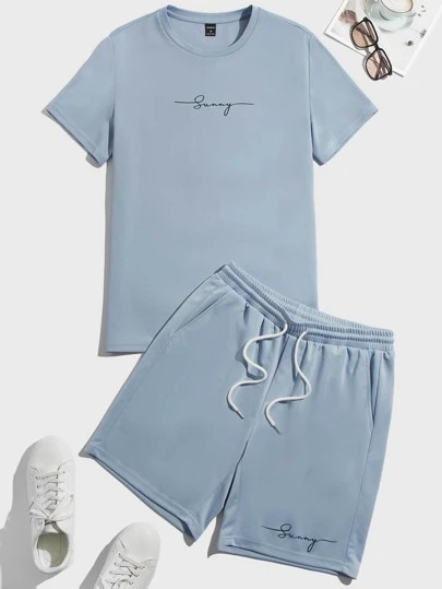 Manfinity Hombres Camiseta con estampado de letra & Shorts de cintura con cordón - Celeste - Añade 1