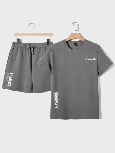 GENTILAND Hombres Camiseta con estampado de letra & Shorts de cintura con cordón - Gris - Añade 8