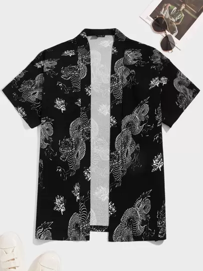 Manfinity RebelGame Camisa kimono de punto suelto para hombres con estampado de dragón - Blanco y Negro - Añade 1