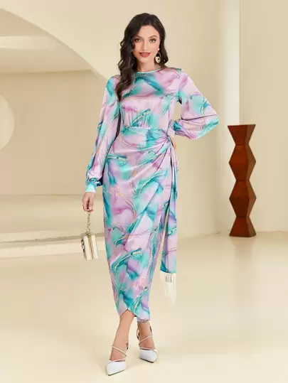 Modelyn Vestido de satén de manga farol con estampado de mármol, detalle de nudo en el lateral y borde envolvente para eventos de noche - Multicolor - Añade 4