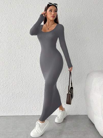 SHEIN PETITE Vestido ajustado de manga larga y cuello redondo de unicolor para mujer, primavera verano - Gris - Añade 1